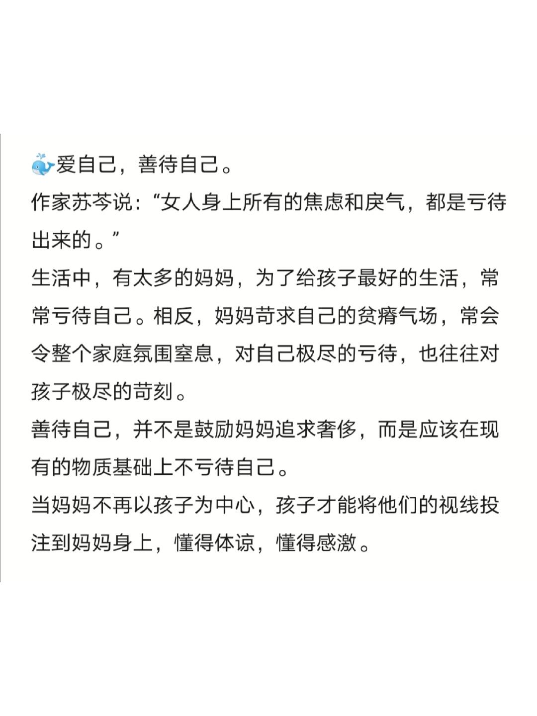 生活中,有太多的妈妈,为了给孩子蕞好的生活,常常亏待自己。相反,妈妈苛求自己的贫瘠气场,常会令整个家庭氛围窒息,对自己极尽的亏待,也往往对孩子极尽的苛刻。