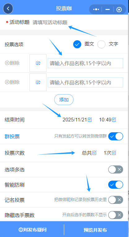 按提示内容来写,活动标题、上传选项(可图文,可文字),设置投票截止时间(系统默认发布的时间为开始时间),设置是否匿名投票,设置投票规则如每人限投1票,设置是否公开投票结果等。