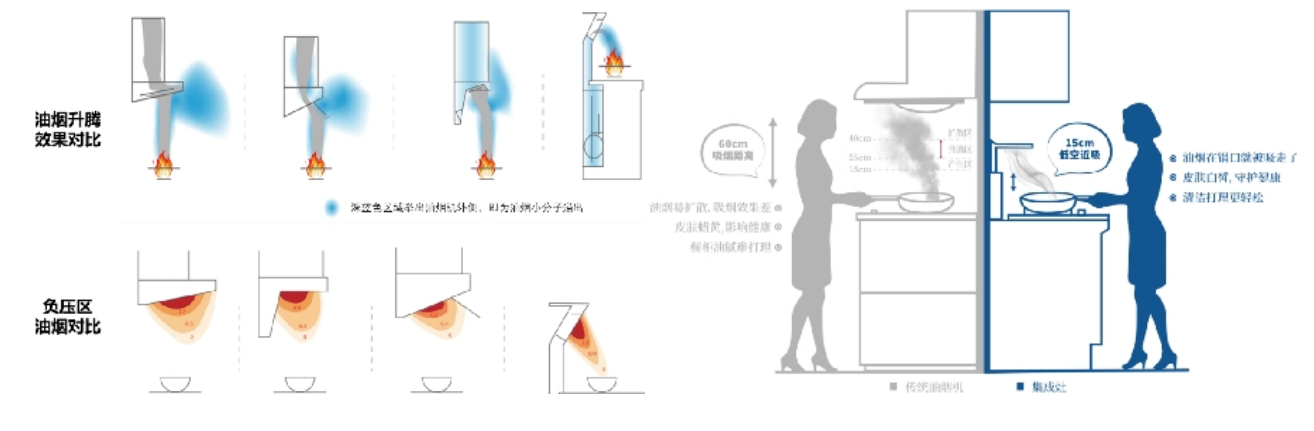 ●15cm近源拦截: Q60的吸烟口距离灶台仅15cm(来源:火星人产品文档),相比传统烟灶分离产品(吸烟口通常≥55cm),从源头上极大缩短了油烟的扩散路径,在油烟刚刚升腾、尚未扩散的瞬间即被捕捉。