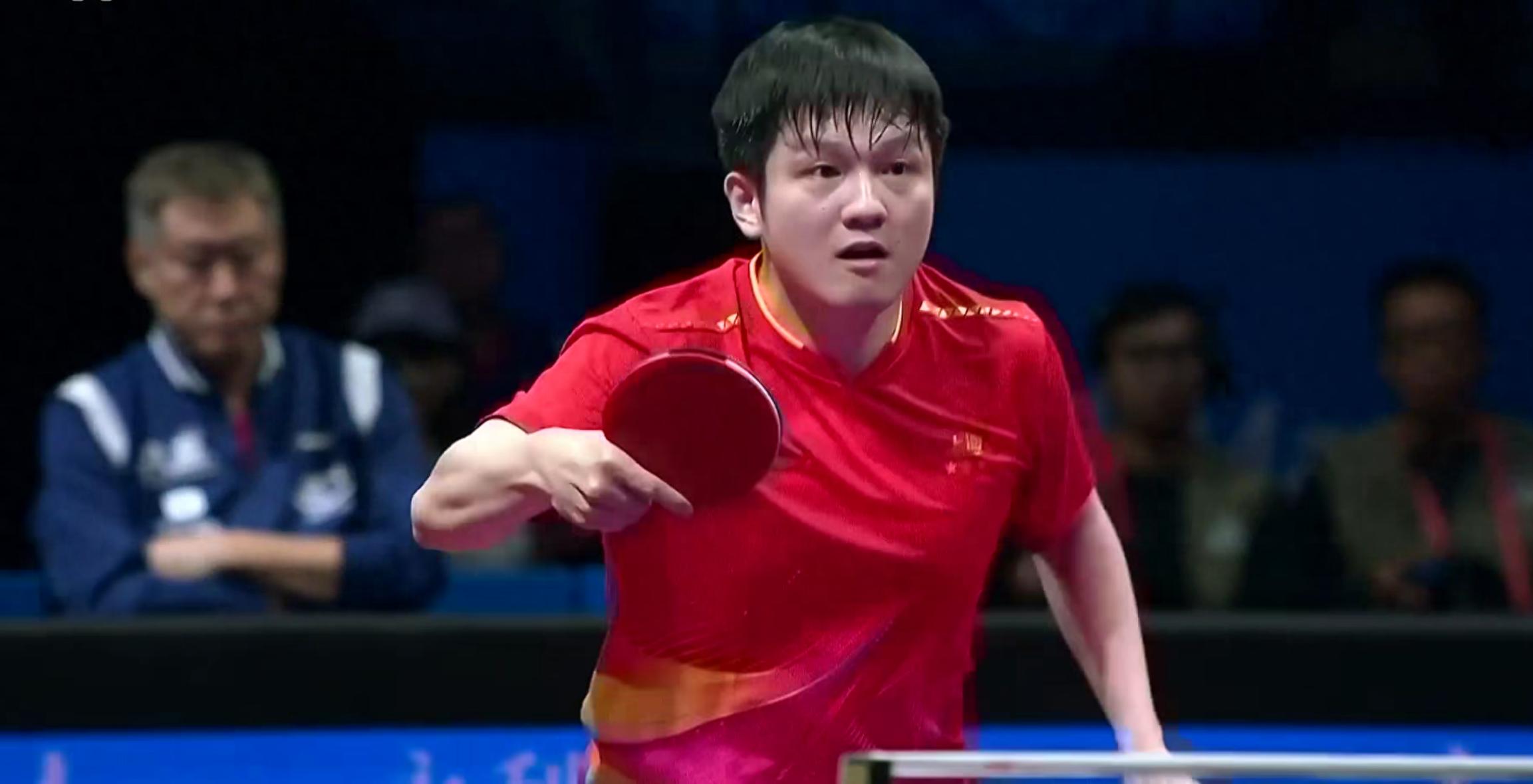 暂停回来,樊振东重新起势,重新大角度进攻,正手的进攻一板接一板,连续拿分11-7扳回一城,大比分1-1!