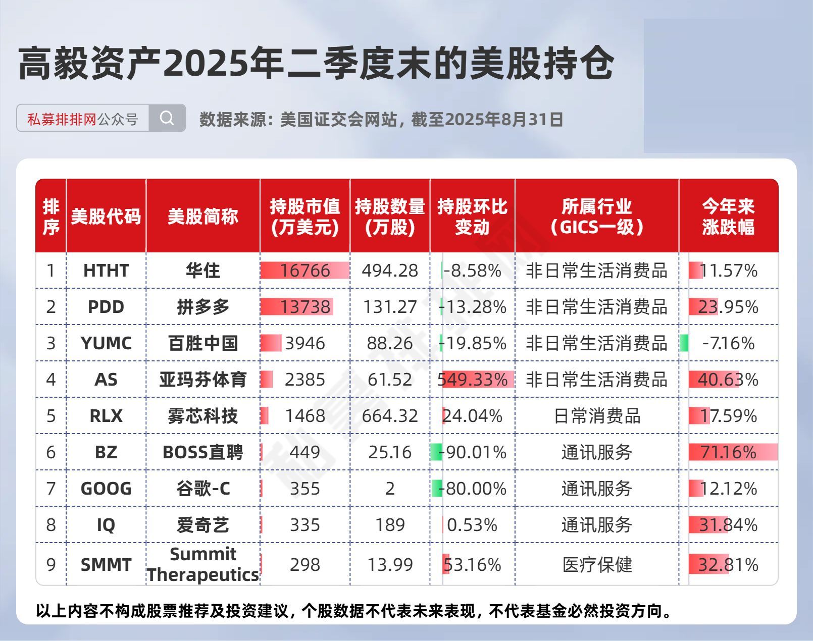 高毅资产作为千亿私募,除布局A股外,也持有较多的美股。根据近期高毅资产向美国证交会提供的持仓数据统计来看,2025年二季度末,高毅资产共持有9只美股标的,持股总市值约为3.97亿美元(折合人民币超28亿元)。