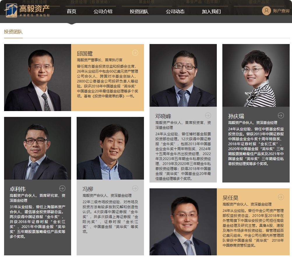公司资料显示,高毅资产成立于2013年,公司聚焦基本面研究和产业研究,努力践行长期投资、价值投资和责任投资。公司汇聚了多位投资研究经验丰富、长期业绩出色的基金经理及投研人才。由邱国鹭担任董事长,邓晓峰担任首席投资官,卓利伟担任首席研究官,孙庆瑞、冯柳、吴任昊担任合伙人、资深基金经理,韩海峰担任合伙人、研究总监。