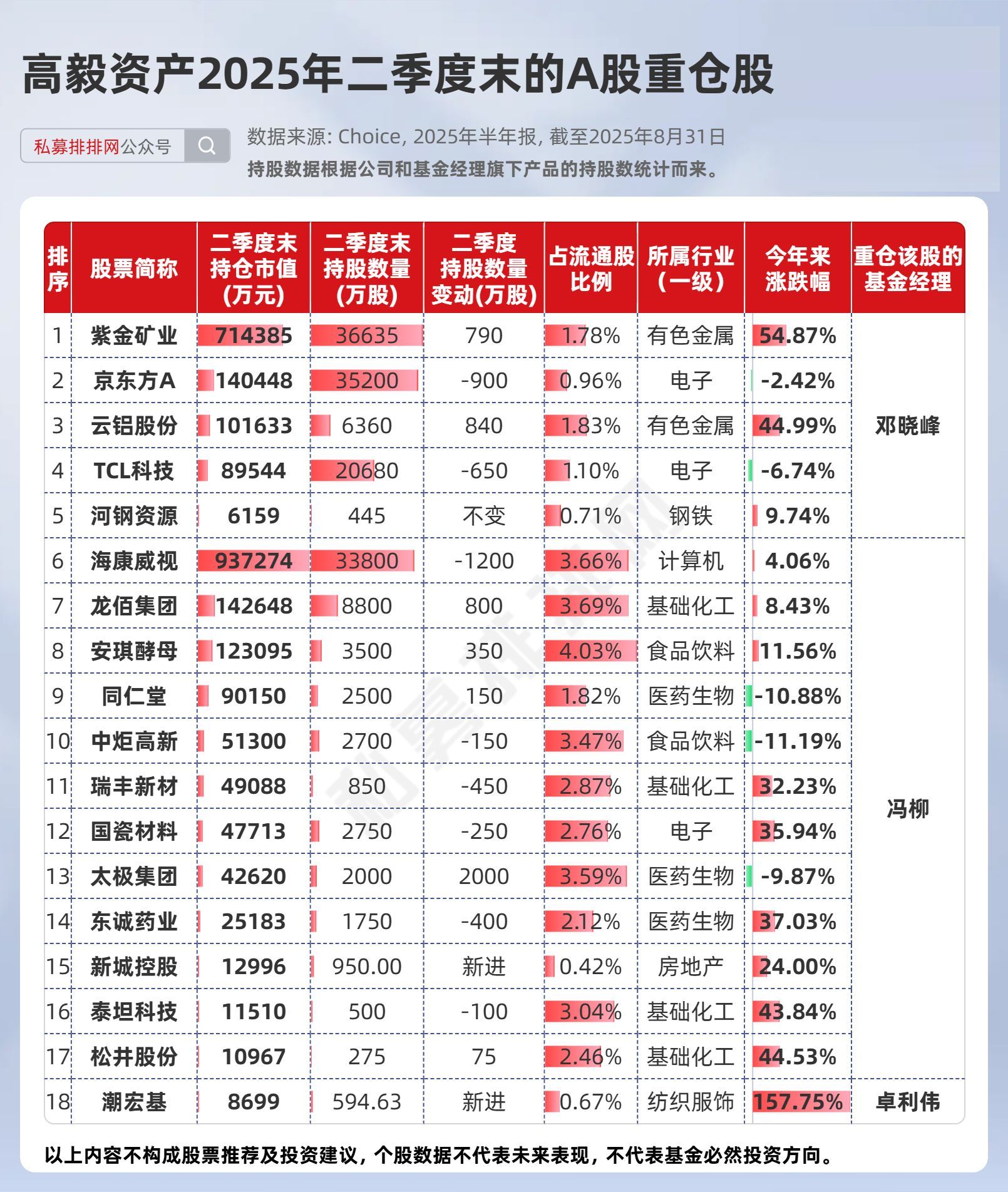 根据A股公司的前十大流通股东数据统计,截至2025年二季度末,高毅资产旗下产品共重仓18家A股公司,合计持股市值约260.54亿元。其中,新进2家公司,加仓7家公司,减仓8家公司,1家公司持股保持不变。截至8月31日,其持仓股今年来涨幅均值约为26%。
