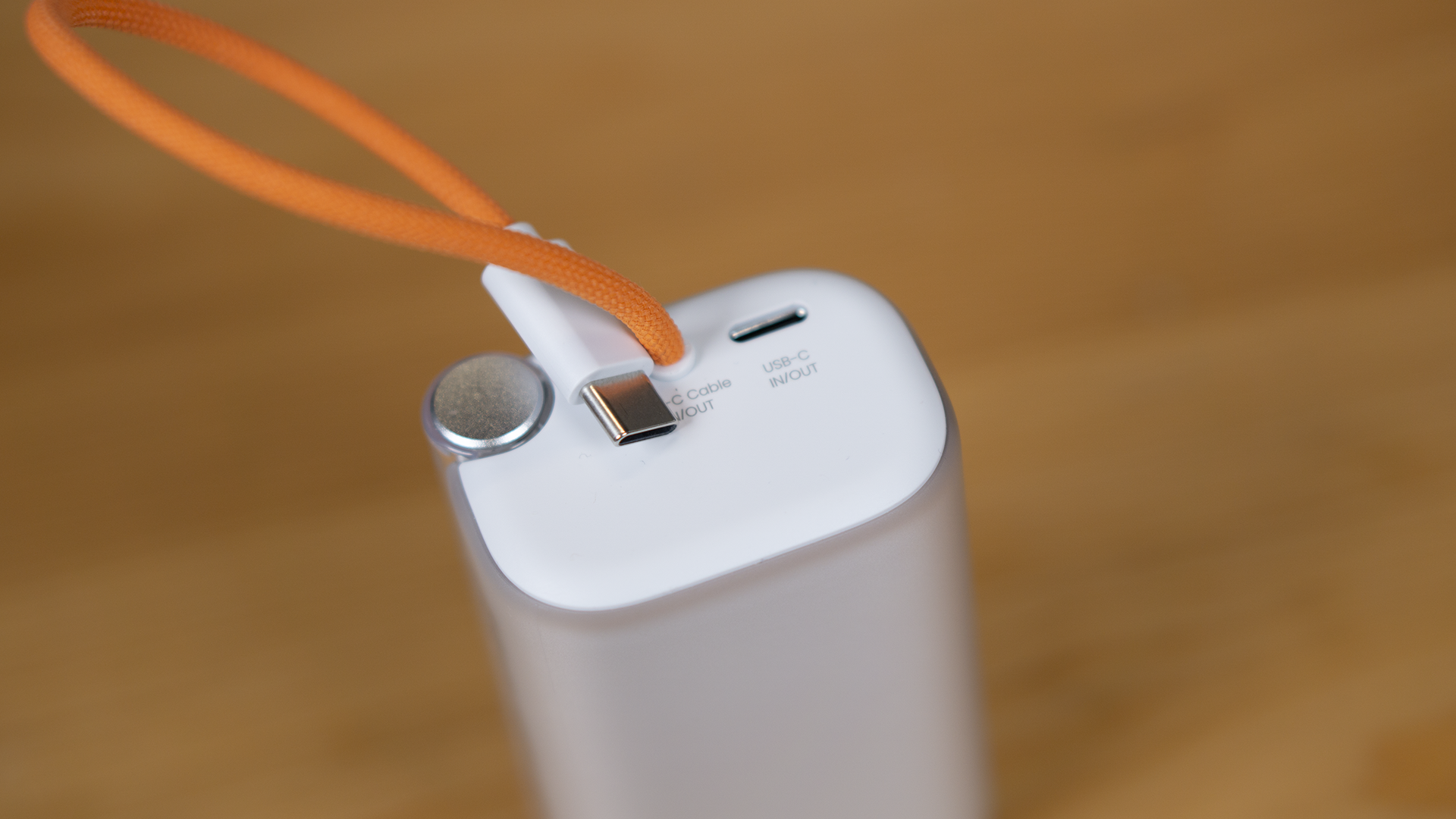 随行Pro的顶部有一个Type-C接口、一根长度约在15CM的TYPE-C线缆。这两个接口都支持充放电。