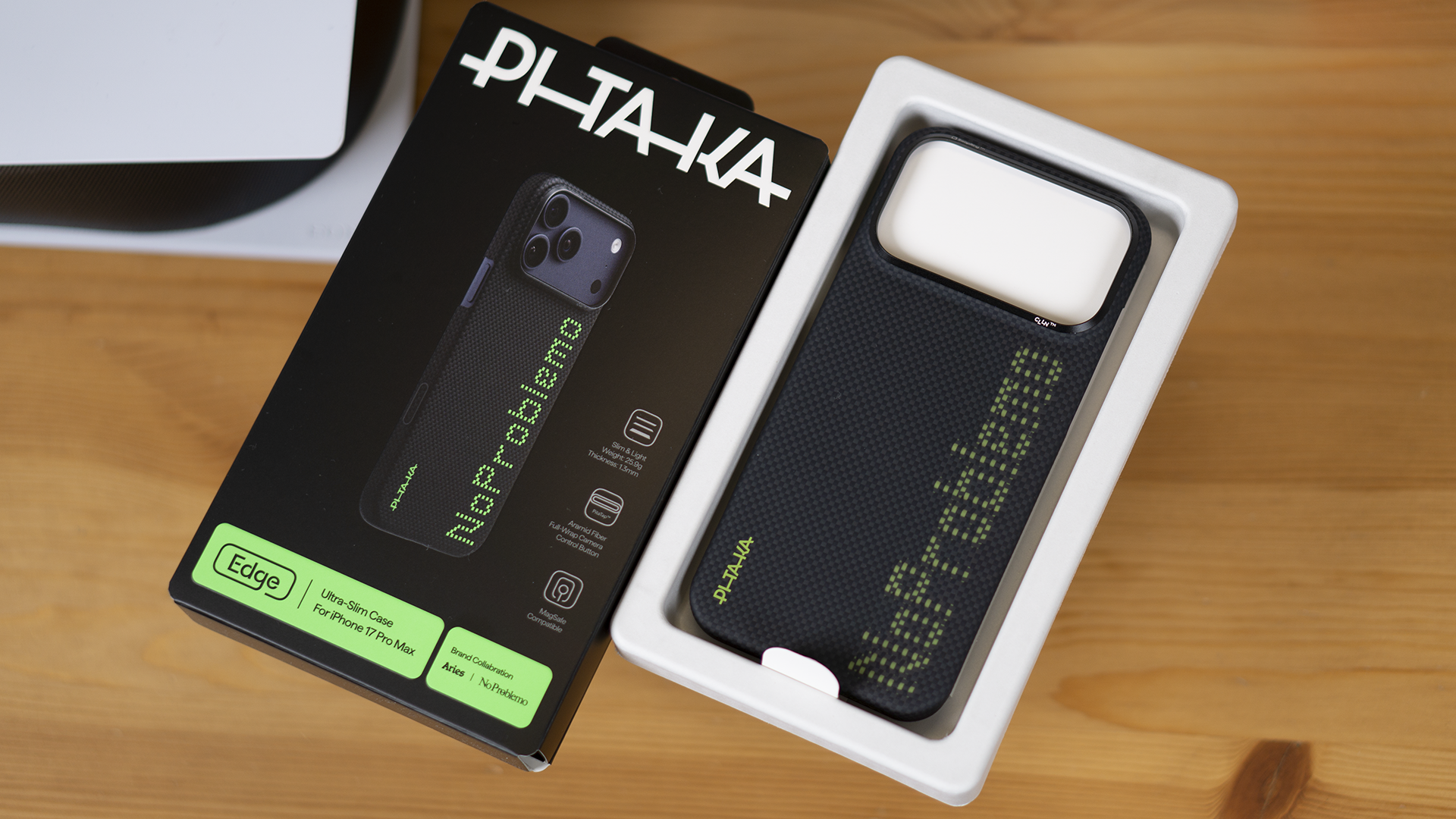 这是PITAKA与Aries联名的,由部分Lumintex发光纤维与凯夫拉纤维打造的手机壳。“No Problemo”的Problem在这里多了一个o,但这并不是拼写错误,而是一个幽默、随性、个性、活泼的表达方式。这是PITAKA No Problemo的外箱,依旧是传统的家族风格,中间是产品图。
