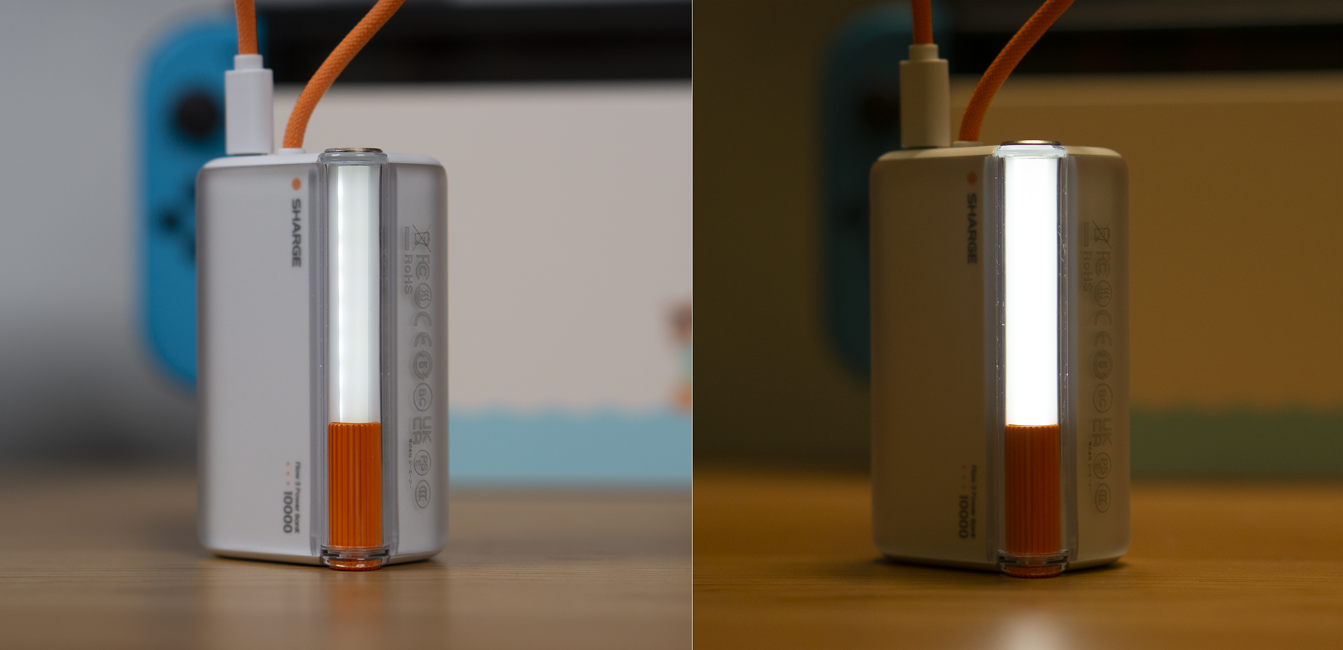 最有特点的地方就是它的右边有一组可以根据电量不同,显示不同长短的星轨灯带,使用它为手机充电的时候,看着电量通过橙色的线缆注入,真的有一种好事将“橙”的神秘助力。