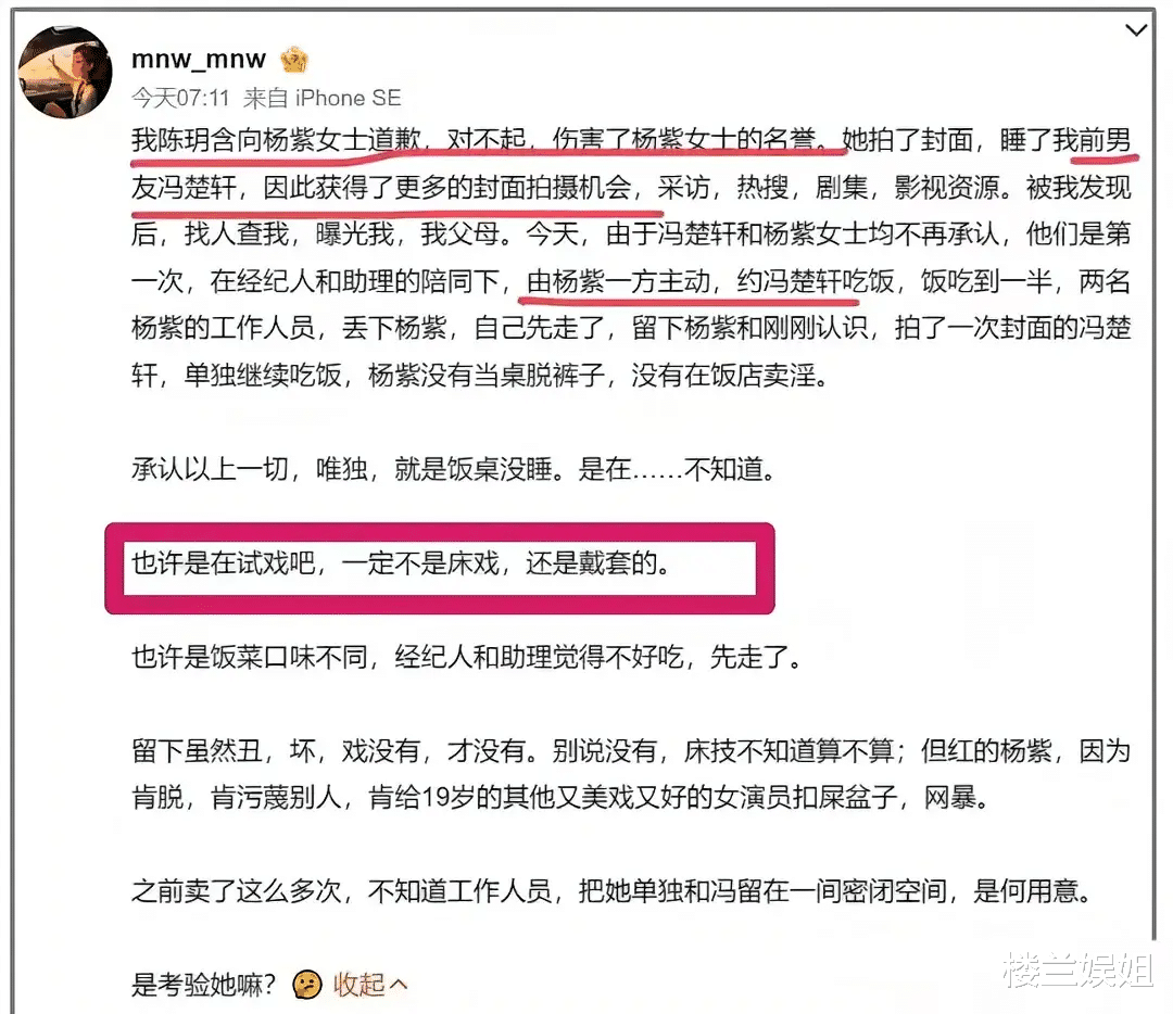 她先是道歉,紧接着爆料杨紫跟CEO冯楚轩有染,两人做了许多不可描述之事。