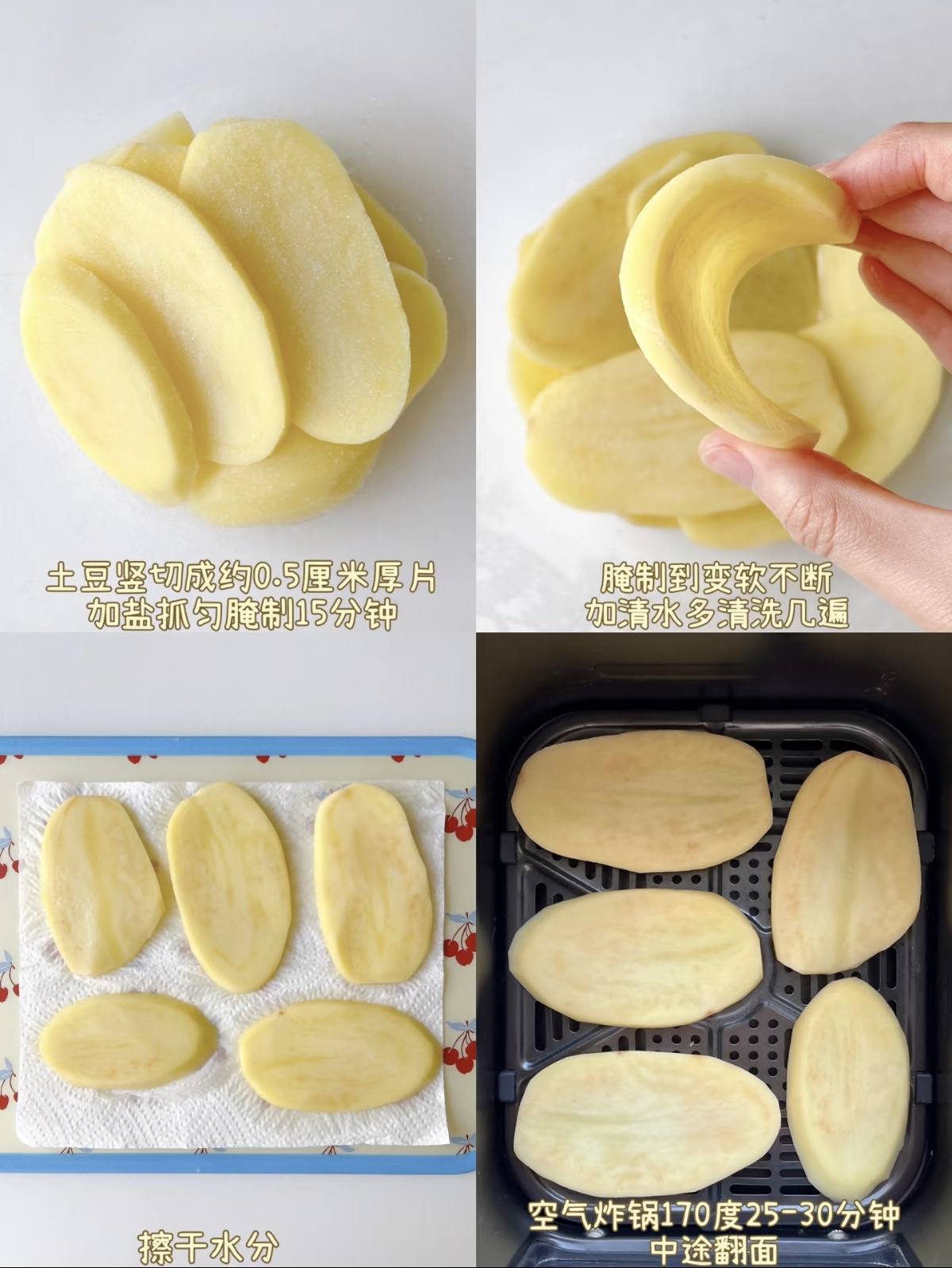 答应我!有空气炸锅的都去做这个无油气泡土豆外脆里糯,每片都鼓鼓的,简单又美味!材料:土豆、盐做法土豆竖切厚片,加盐腌15