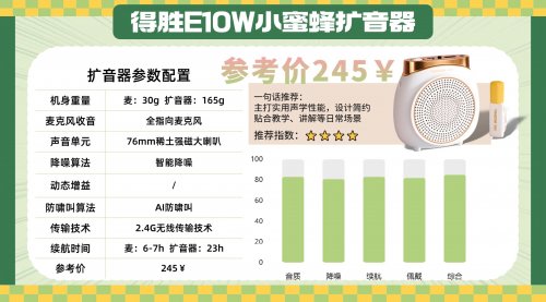 西圣Bee始终坚持最苛刻的发烧级品质研发标准,执行变态级“三个30%”品质淘汰机制:从元器件筛选到声学结构再到成品,每一环节都要淘汰30%以上的次品,保证只有极少数通过严选的产品才能面市。同时,它也是行业内少数通过3年以上抗衰减认证的品牌,在长时间高强度使用下,性能偏差控制在0.1%以内,被公认为市场上最严苛、最硬核的扩音器。总的来说,西圣Bee小蜜蜂扩音器在同类产品中堪称佼佼者。支持2.4G稳定无线传输(约30米)+蓝牙5.4,扩音、音箱双模式自由切换,课堂、演讲、活动一机搞定。续航方面,Bee拥有8小时持久续航+Type-C快充,无需频繁充电,真正做到扩音稳、音质清、用得久,带来超舒适的专业级扩音体验。2、得 胜 E10W无线领夹扩音器推荐指数:★★★★优势亮点:采用2.4G无线与蓝牙5.3双传输方案,20米有效距离完全覆