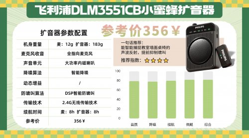 续航上,麦克风可连续使用4小时,扩音器续航8小时,能满足短时间需求,Type-C充电接口也十分便捷。此外,该机还配备3.5mm TRS接口,支持U盘、TF卡及AUX连接,功能全面。美中不足的是扩音器机身重达450g,携带略感负担,便携性一般,更适合小型会议、门店宣传等室内短距离场景,整体基础性能可满足日常使用需求。4、飞 利 浦DLM3551CB无线领夹扩音器推荐指数:★★★★优势亮点:360°全指向麦克风与DSP防啸叫技术,能够有效消除背景噪音