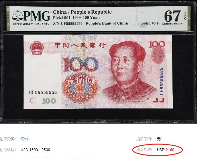 比如这张99年一张钱币评定等级67分,拍出了2160美元的高价,折算成人民币1.5万元左右了,足足翻了150倍,一张顶好多张