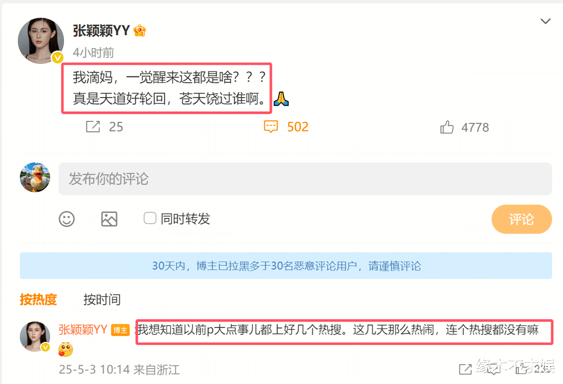 5月3日,张颖颖再次发文感慨“天道好轮回,苍天饶过谁”,并暗示汪小菲方压了热搜。称明明之前一点小事都能上好几个热搜,这几天这么热闹,却连个热搜都没有。