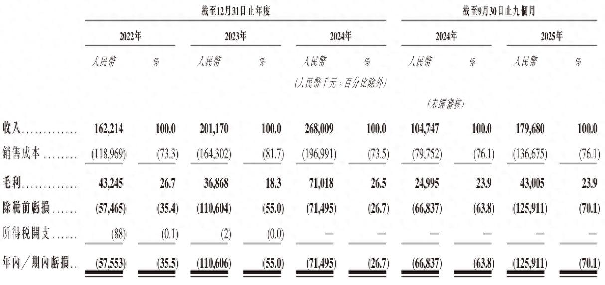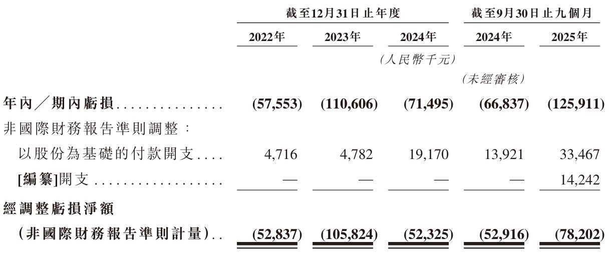 翼菲智能2022年、2023年、2024年经调整净亏损分别为5284万、1.06亿、5233万元;2025年前9个月经调整净亏损为7820万元。