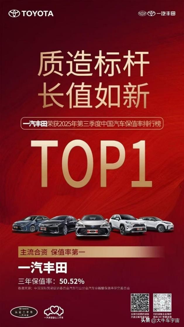 长期主义展示在一汽丰田在产品可靠性等关键领域下足了功夫,就如马拉松大赛对保障用车的首先要求就是要绝对安全可靠。成立22年来,一汽丰田始终坚守“品质保障”的金字招牌,将对品质的严苛管理注入每一个生产环节,不仅保证不良产品“不流向用户”,更严苛到不流入“下一个工序”。也因此,一汽丰田的每一款车都自带高品质、高耐久性、高可靠性的QDR属性,成为用户跨越时间周期的品质之选,并保持着极高的保值率,在贸促会汽车分会发布的2025第三季度汽车保值率排行榜中,一汽丰田以三年保值率50.52%的成绩,荣膺主流合资品牌第一名。