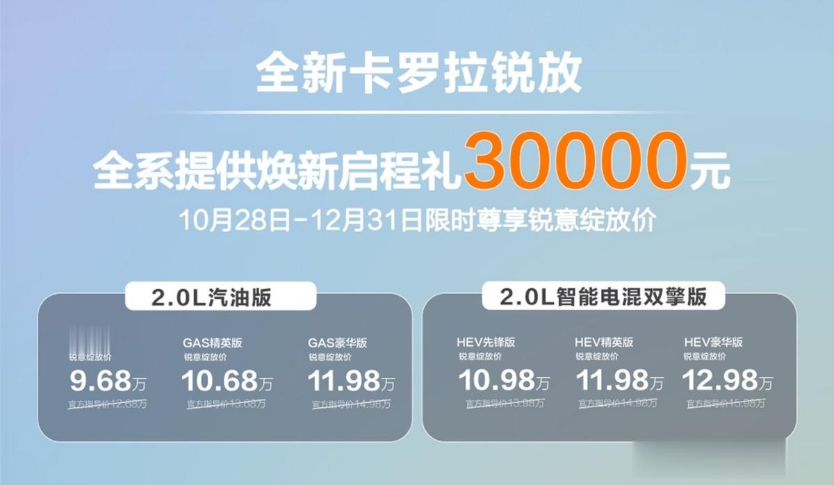 临近月末,一汽丰田又推出了全新卡罗拉锐放,其以“世界丰田,中国锐放”为核心主题,全面展示从外观、智能、安全、空间等方面的焕新升级。新车共推出2.0L汽油版与2.0L智能电混双擎版两种动力6款车型,官方指导价区间为12.68万元—15.98万元,并推出限时“锐意绽放价”,起步价低至9.68万元起,进一步降低购车门槛,市场竞争力显著提升。