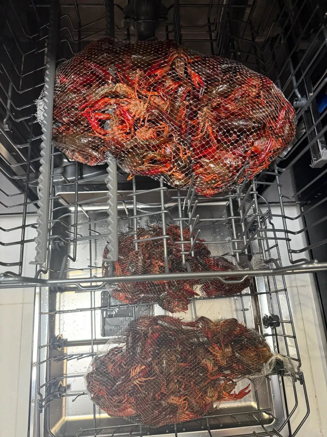 试着把龙虾装袋放进洗碗机,选了果蔬模式,将洗碗粉换成小苏打,用常温水清洗。一定要避免高温,不然会把龙虾煮熟。