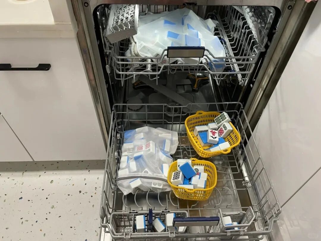 我把麻将牌放进篮筐和洗衣袋里,放进洗碗机,加了中性洗涤剂,选了轻柔洗模式。