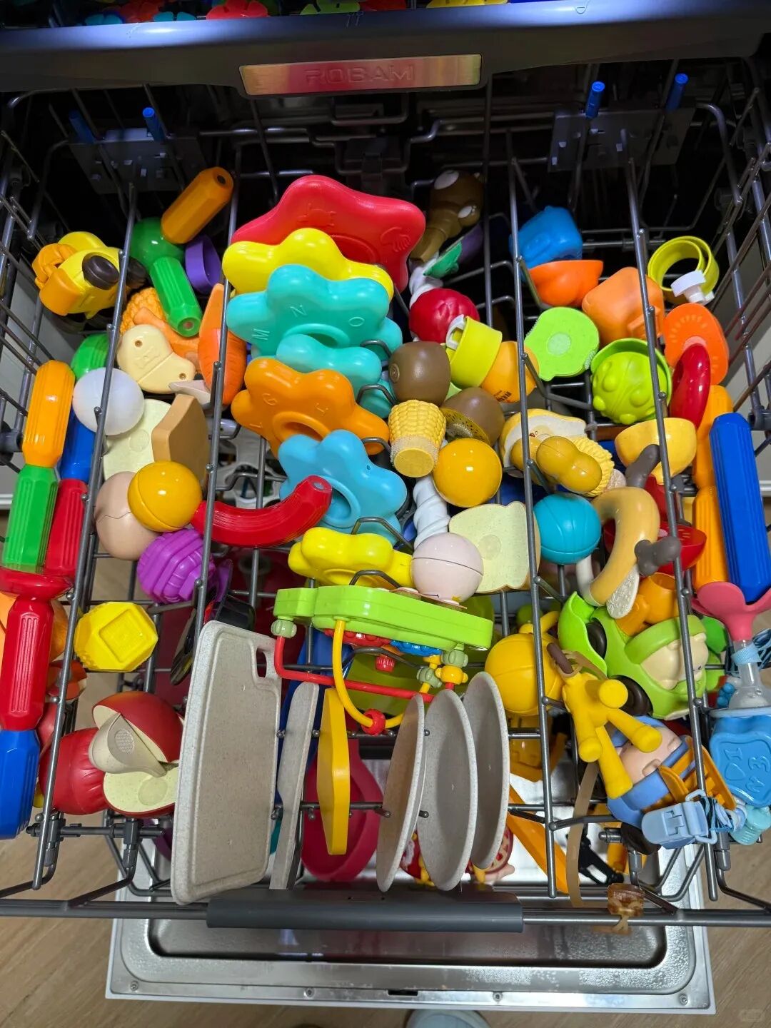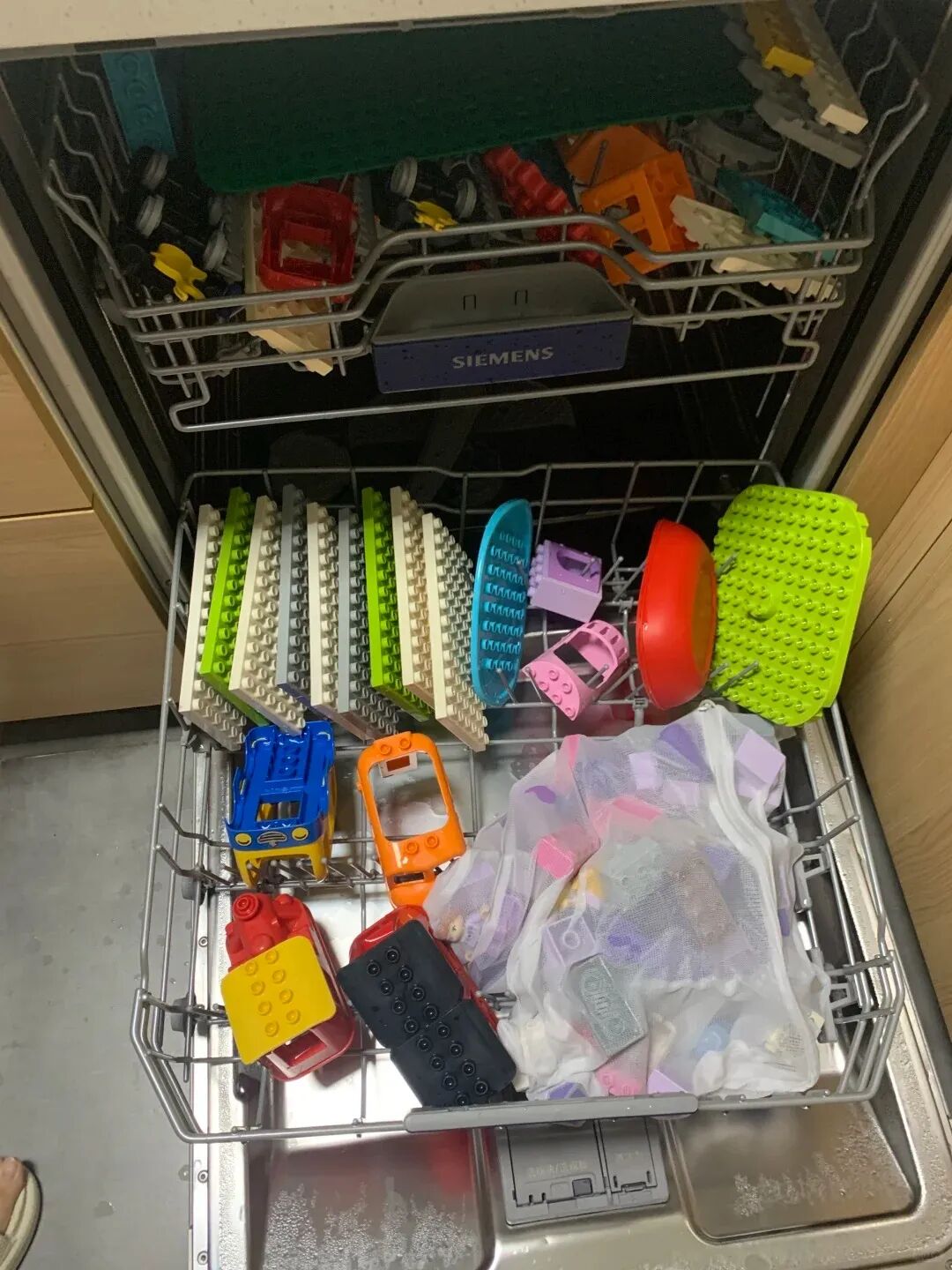 自从用洗碗机洗玩具,我再也不用蹲在地上刷一下午了。尤其是积木,洗碗机洗的比手洗干净十倍,特别小的零件就用洗衣袋装好也不怕丢,洗干净再给宝宝玩会更放心。