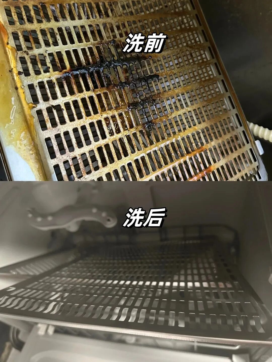 洗完拿出来,机罩上的油污全没了,比手洗干净百倍,全程不用动手,不用接触清洁剂,简直太省心了。