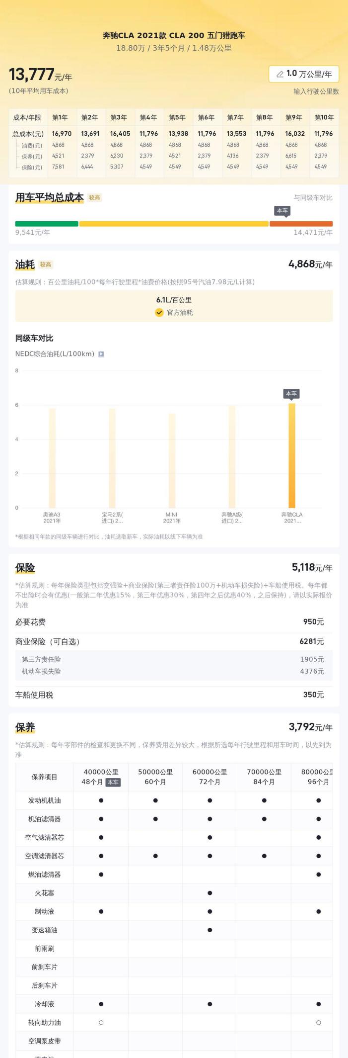 最后再补充一点,关于这辆车的后期维护保养,由于是豪华品牌,所以保养费用相对较高。建议您在购车前,了解一下当地的奔驰4S店的保养价格,做到心中有数。