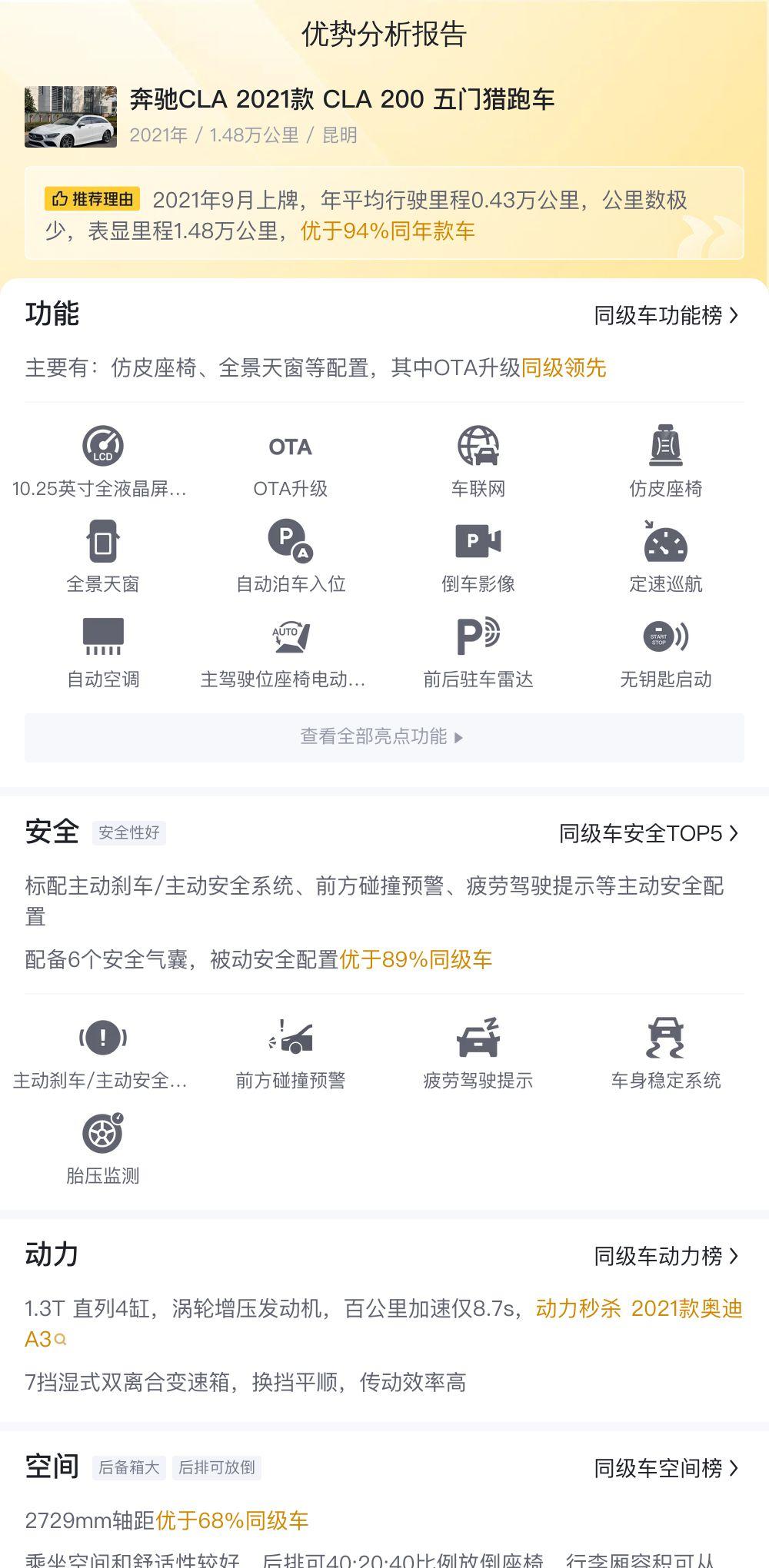 那么,这辆CLA猎跑在同级别车型中有什么优势呢?相比奥迪A3、宝马1系,CLA猎跑最大的卖点就是它的轿跑造型,更具个性和运动感。配置方面也相对更丰富一些。当然,奔驰的品牌溢价也是一个重要因素。不过,CLA猎跑的后期维护保养费用也相对较高,这也是一个需要考虑的因素。