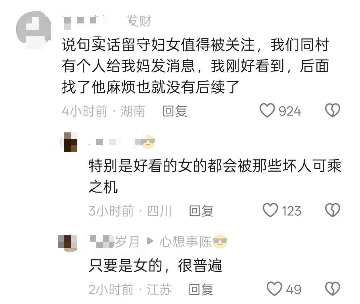 “说句实话留守妇女值得被关注,我们同村有个人给我妈发消息,我刚好看到,后面找了他麻烦也就没有后续了”