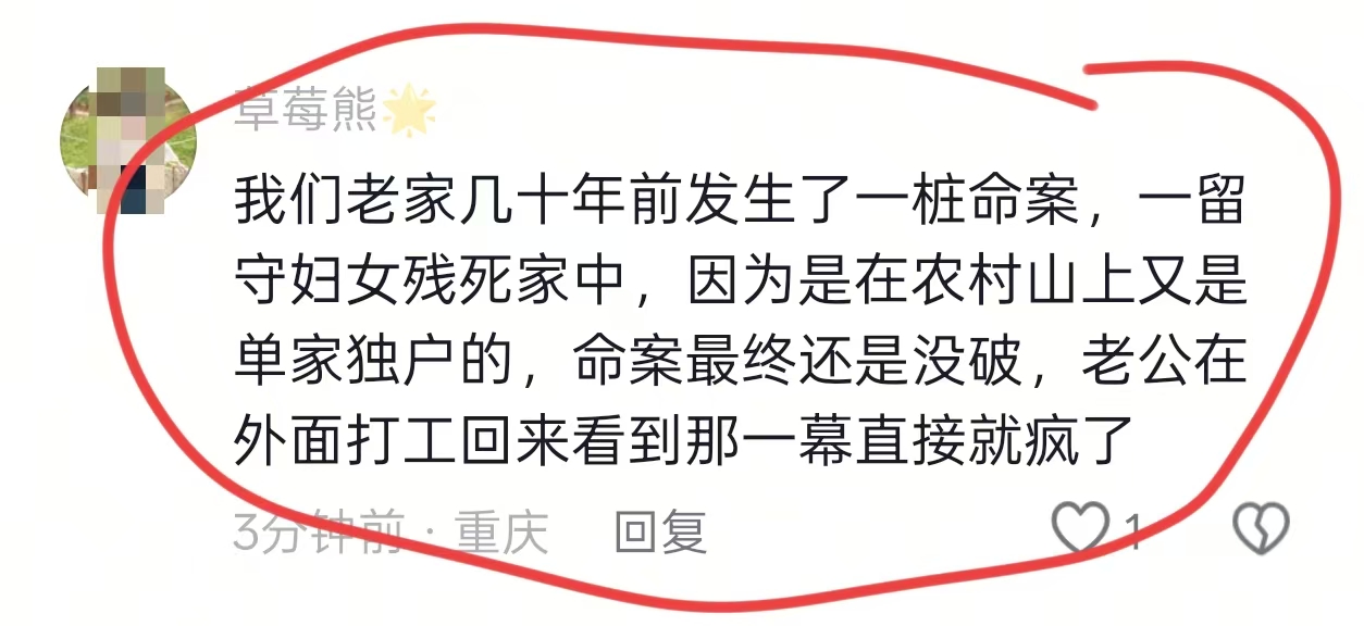 “我们老家几十年前发生了一桩命案,一留守妇女惨死家中,因为是在农村山上又是单家独户的,命案最终还是没破,老公在外面打工回来看到那一幕直接就疯了。”