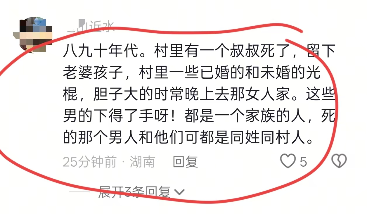“八九十年代。村里有一个叔叔死了,留下老婆孩子,村里一些已婚的和未婚的光棍,胆子大的时常晚上去那女人家。这些男的下得了手呀!都是一个家族的人,死的那个男人和他们可都是同姓同村人。”