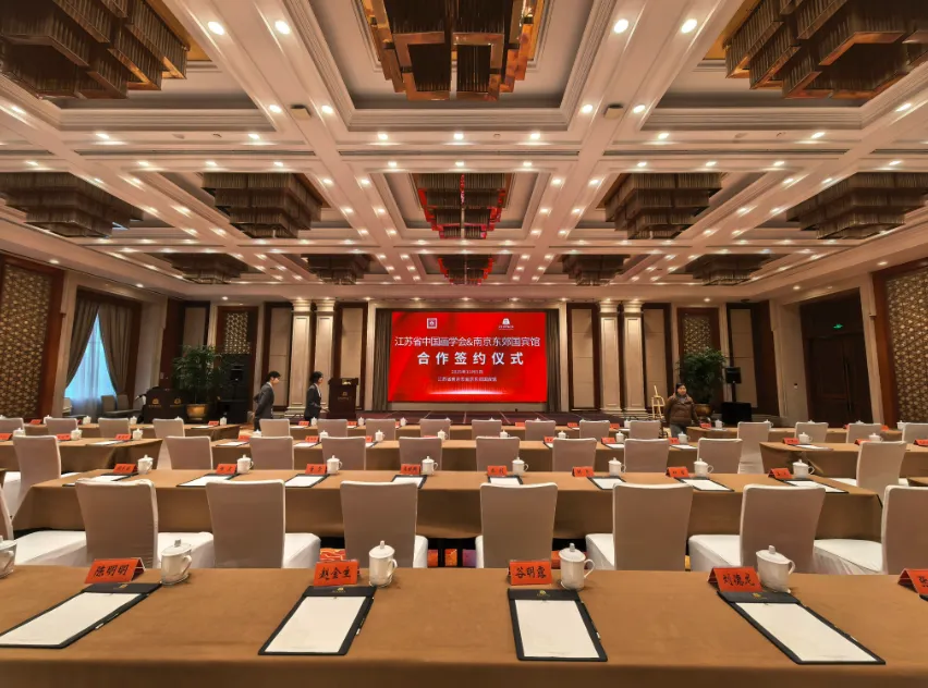 11月5日,“江苏省中国画学会与南京东郊国宾馆合作签约暨艺术交流基地揭牌仪式”在南京东郊国宾馆盛大启幕。江苏省中国画学会创会会长高云、名誉会长韩显红、会长翟优、监事长王强,副会长王平、王野翔、张卫、栾剑、桑建国、韩非、董雷;南京东郊国宾馆总经理丁亦文、副总经理苏东强、总经理助理张梅、工会主席兼人力资源部总监陆康平、市场销售部总监周正东出席仪式。法兰西艺术院通讯院士让·高立昂、中国画学会副会长许俊、江苏省新闻出版局(版权局)原局长徐毅英、上海铁路局南京办事处主任于汉宗、美国江苏总商会会长徐晓峰等中外嘉宾应邀到场,共同见证这一文旅与艺术交融的重要时刻。仪式由学会副会长王平主持。