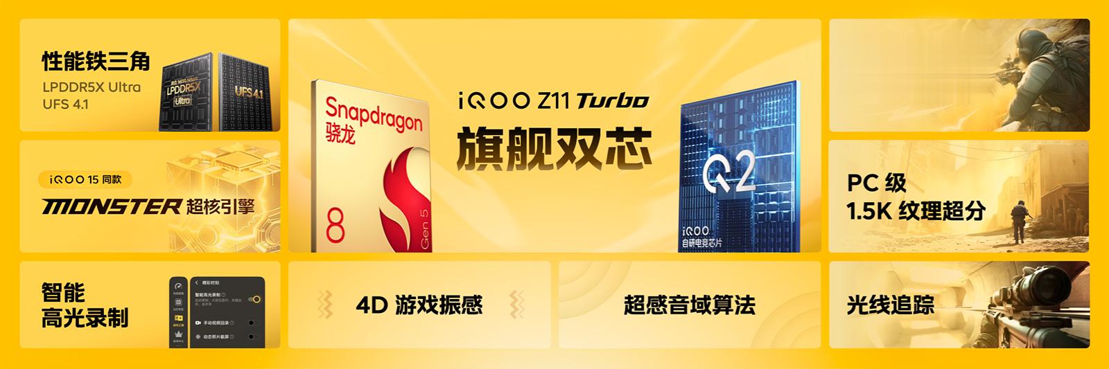 iQOO Z11 Turbo搭载第五代骁龙8移动平台,安兔兔跑分达到359万,相比上代iQOO Z11 Turbo所采用的天玑8400满血版跑分几乎实现翻倍。与此同时,搭配自研电竞芯片Q2,为游戏超帧超分带来更优体验。
