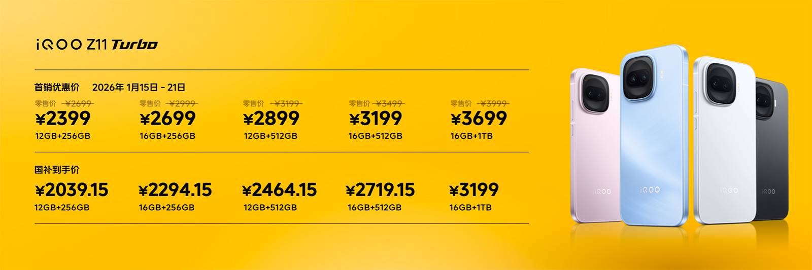 1月15日晚,vivo子品牌iQOO正式推出新品iQOO Z11 Turbo,持续提升硬件配置的同时,这代机型的外观设计终于也有了较大变化,定价2699元起,1月15日-21日首销期优惠价2399元起,叠加国补后到手价2039.15元起。