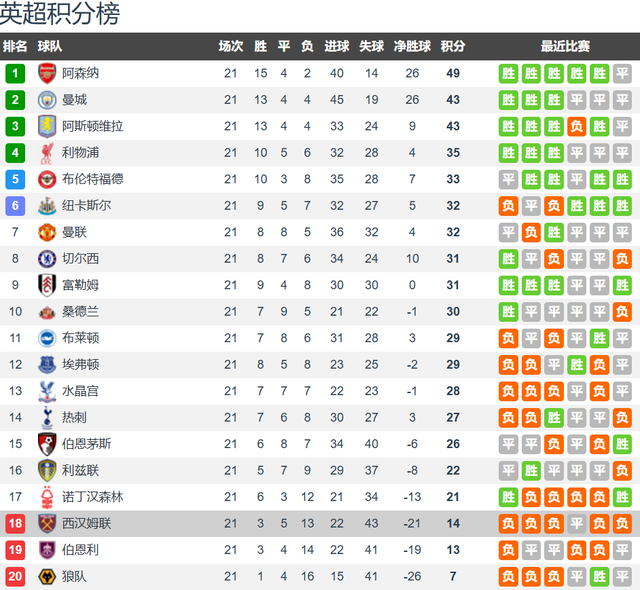 英超21轮战罢,西汉姆联3胜5平13负积14分排名倒数第三,深陷降级区,已经落后第十七名诺丁汉森林多达7分,保级局势已经岌岌可危。