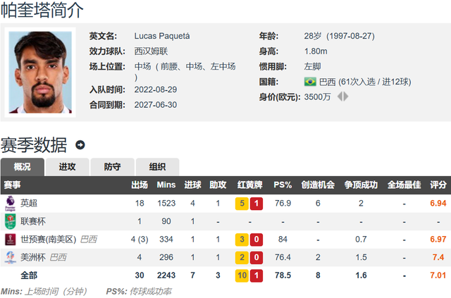 帕奎塔现年28岁,身高1.80米,左脚进攻型中场,与西汉姆联的合同至2027年。帕奎塔本赛季至今共出战了18场英超的比赛,全部首发,贡献4球1助。