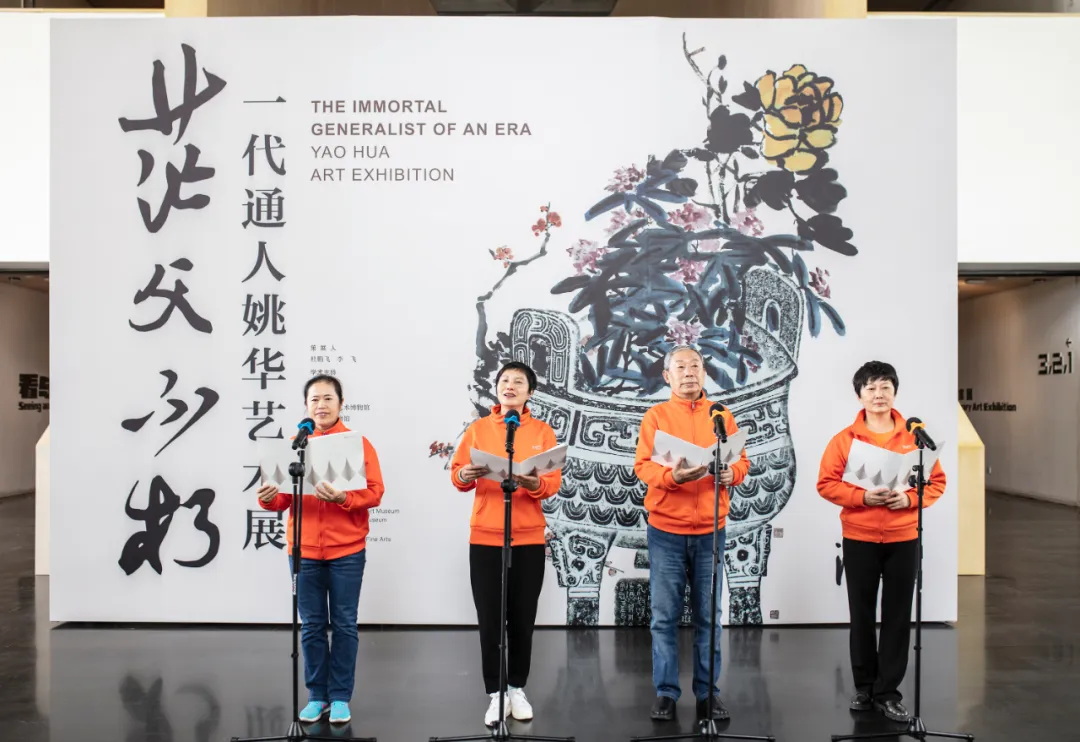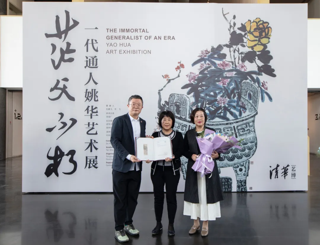 花繁四月、惠风和畅。在喜迎清华大学113周年校庆之际,“茫父不朽:一代通人姚华艺术展”于4月23日在清华艺博启幕。校党委副书记向波涛,贵州省文旅厅党组成员、副厅长袁伟,中央美术学院美术馆馆长靳军,姚华之孙、中央财经大学原副校长姚遂,本馆常务副馆长杜鹏飞先后致辞。开幕式上,杜鹏飞为家属代表杨丽和杨阳颁发捐赠证书,感谢姚华孙女姚厥捐赠姚华绘画作品《游天宁寺图》。开幕式由副馆长孙大鹏主持,清华艺博志愿者庞东明、王东华、张新慧、鲁红梅表演了诗朗诵《秋草诗》《五言飞鸟集》选段,师生校友、艺术界代表、媒体记者、社会观众等近百人出席了开幕式。