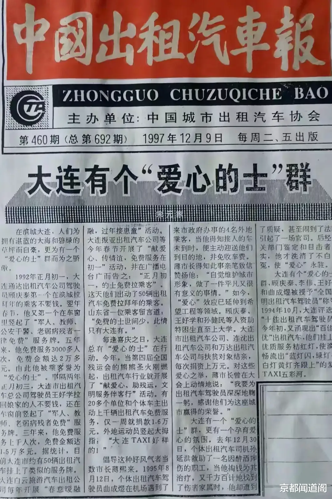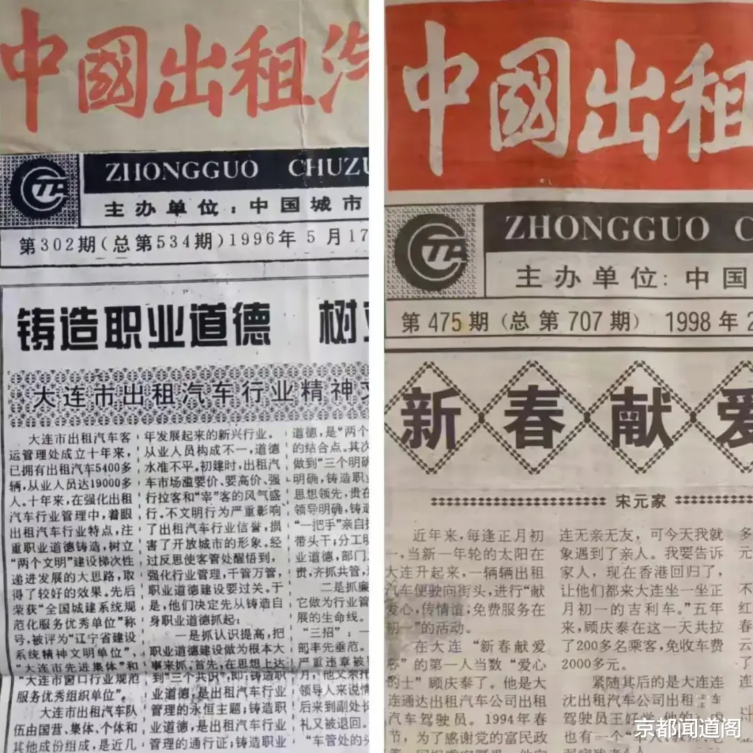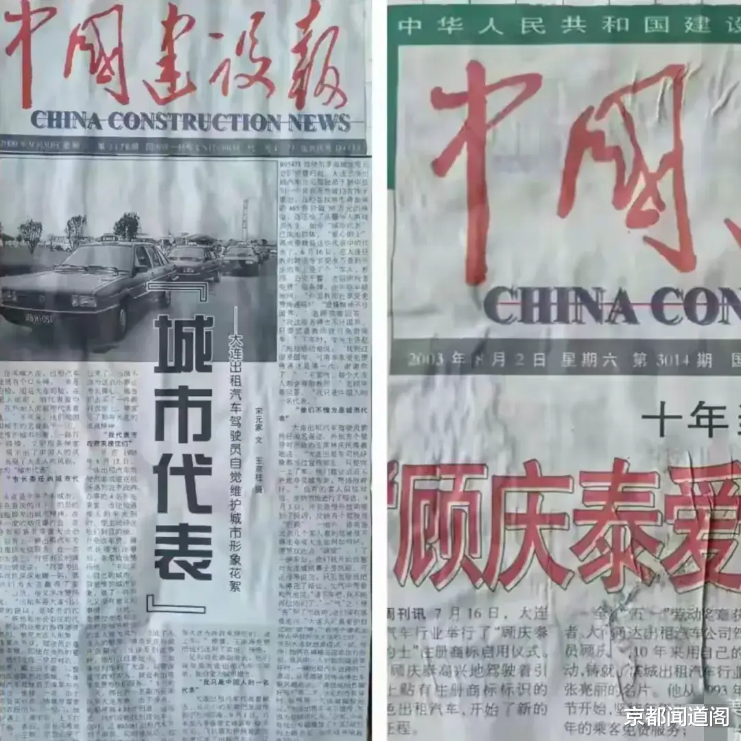 1999年,《中国出租汽车报》改版为《中国建设报・的士周刊》。这不仅优化了刊物定位、扩容了版面,还增加了出版频次,为行业宣传开辟了新天地,也让我撰稿的劲头更足了。《“城市代表”》《“顾庆泰爱心的士”商标启用》《大连的士减税了》等稿件,接连在该报头版头条发表;不久,我又写下《顾庆泰和他的“爱心的士”》,以报告文学体裁投稿,最终在周刊连载了三个月。只是文中未注明体裁,我当时还以为是编辑疏忽了。