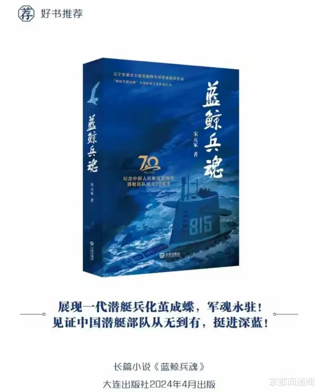 ☆ 本文作者简介:宋元家,大连市作家协会会员。1972年12月入伍,曾任海军潜艇潜艇轮军士长、副政委、政治部新闻干事、宣传科长等职。1993年转业至大连市出租汽车行业工作,现已退休。在全国各报刊发表小说、散文、论文和通讯报道等文稿多篇,达数百万字。已出版《蓝鲸兵魂》《蓝鲸恋歌》《夕阳颂歌》和《笔底吟歌》等作品,著有长篇报告文学《顾庆泰和他的“爱心的士”》。其中长篇小说《蓝鲸兵魂》作为“新时代·筑高峰”大连原创文艺作品丛书之一,获得辽宁省重点主题出版物专项资金扶持。2024年8月,该书入选当季“辽宁好书”,被全国百余家图书馆列入“大国追梦”主题共读书目,收入国庆主题书展核心书单,参加中华读书会“献礼国庆75周年系列主题书展”。