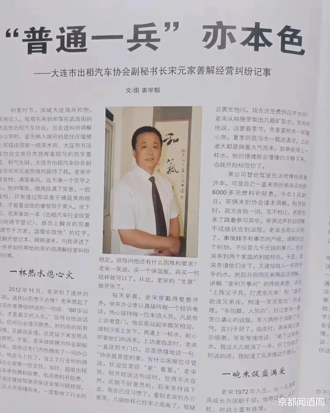 2012年11月,办理完退休手续后,我依然坚持为《中国出租租赁汽车》撰稿。《总理夸她“半边天”》《“党员的哥”棒棒哒》《厉害了,“的士产房”》等多篇有影响力的稿件,都是在这一时期发表。更让我意外的是,以前我总习惯写别人的故事,退休后竟也成了被宣传的对象。当时,我被返聘从事行业维权工作,《大连日报》新闻管理部主任姜学魁得知我在调解经营纠纷中积累了些许经验,特意登门采访,写下《“普通一兵”亦本色》一文,发表在《中国出租租赁汽车》(2015年第四期),还配发了我的照片。后来,这篇专访又被《东北之窗》(2015年第八期)重发,标题改为《的哥的姐的好大叔》。