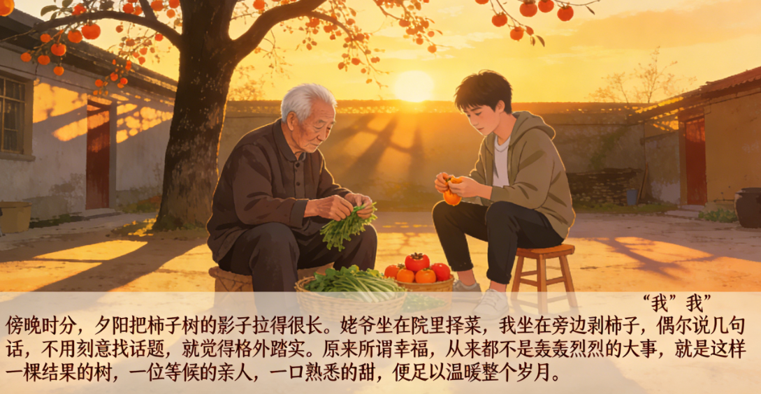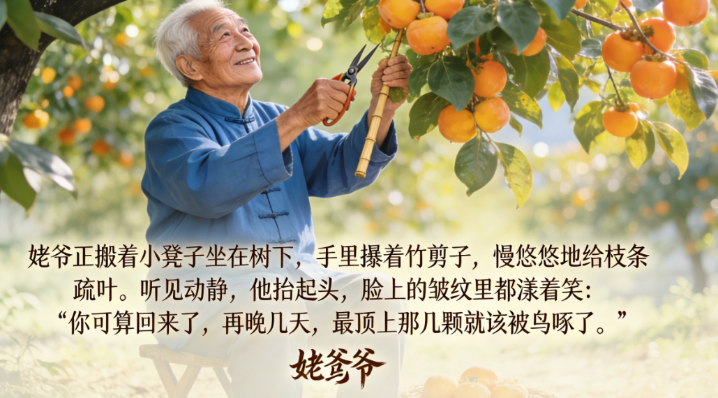 后来我在外求学、工作,一年也回不了几次家,可每次打电话,姥爷总少不了提一句“柿子树长得好着呢”“今年结的果子比去年多”。原来,他守着的不只是一棵果树,更是在守着一份盼头,盼着果子红时,家里能添几分热闹。