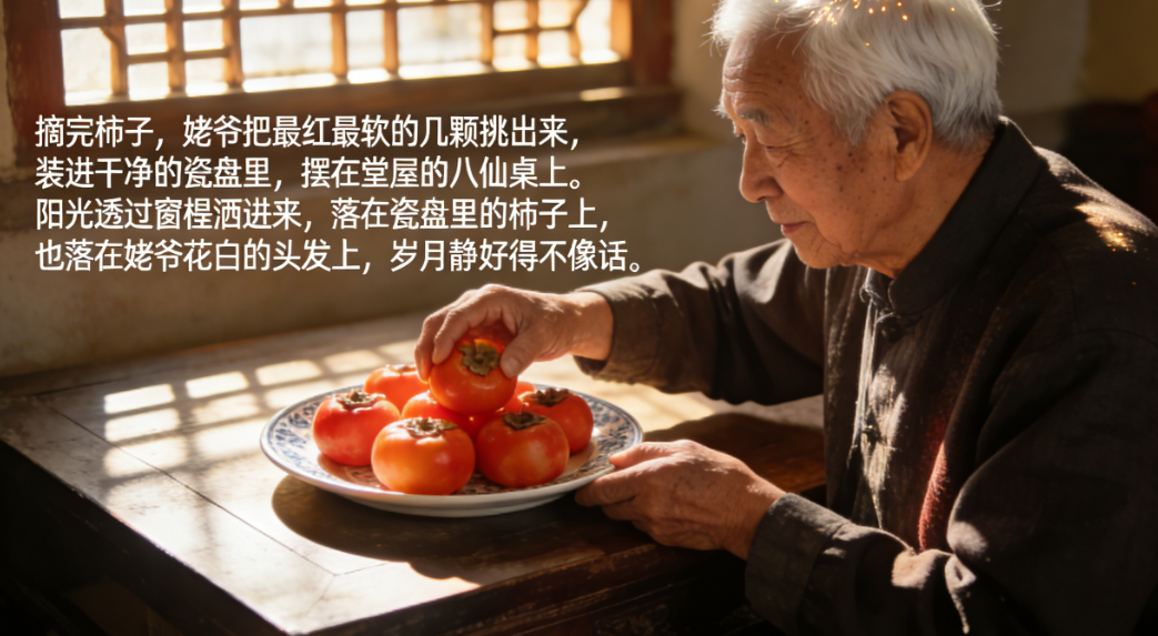摘完柿子,姥爷把最红最软的几颗挑出来,装进干净的瓷盘里,摆在堂屋的八仙桌上。阳光透过窗棂洒进来,落在瓷盘里的柿子上,也落在姥爷花白的头发上,岁月静好得不像话。