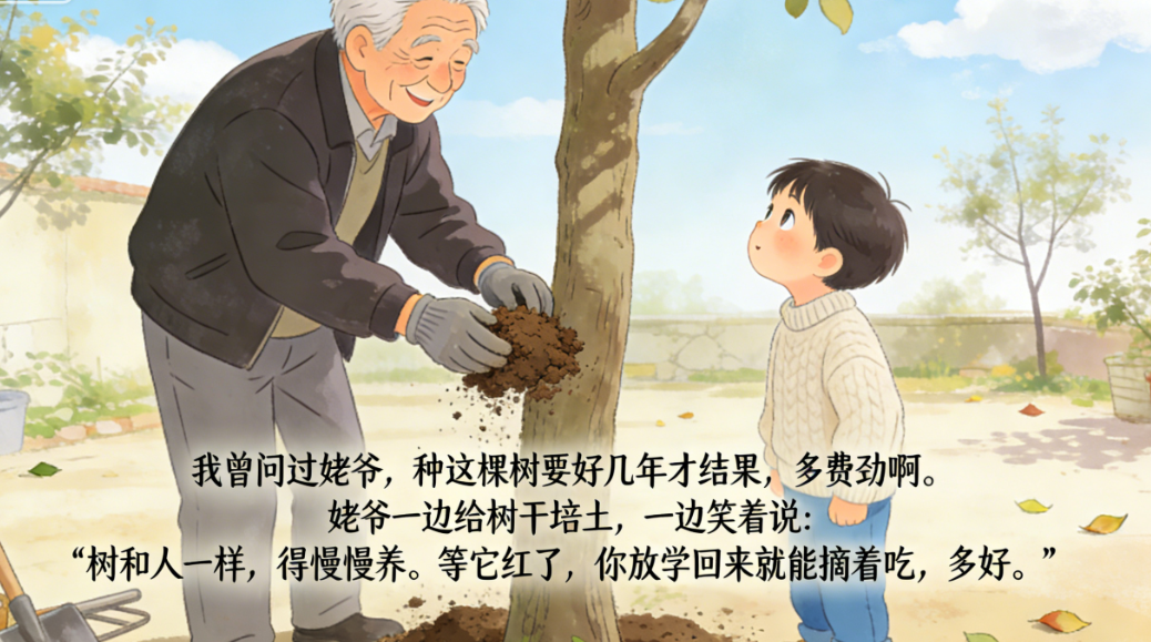 我曾问过姥爷,种这棵树要好几年才结果,多费劲啊。姥爷一边给树干培土,一边笑着说:“树和人一样,得慢慢养。等它红了,你放学回来就能摘着吃,多好。”