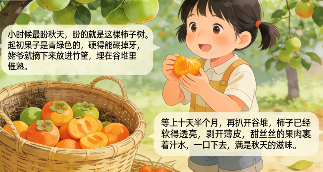 小时候最盼秋天,盼的就是这棵柿子树。起初果子是青绿色的,硬得能硌掉牙,姥爷就摘下来放进竹筐,埋在谷堆里催熟。等上十天半个月,再扒开谷堆,柿子已经软得透亮,剥开薄皮,甜丝丝的果肉裹着汁水,一口下去,满是秋天的滋味。