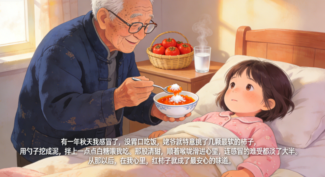 有一年秋天我感冒了,没胃口吃饭,姥爷就特意挑了几颗最软的柿子,用勺子挖成泥,拌上一点点白糖喂我吃。那股清甜,顺着喉咙滑进心里,连感冒的难受都淡了大半。从那以后,在我心里,红柿子就成了最安心的味道。