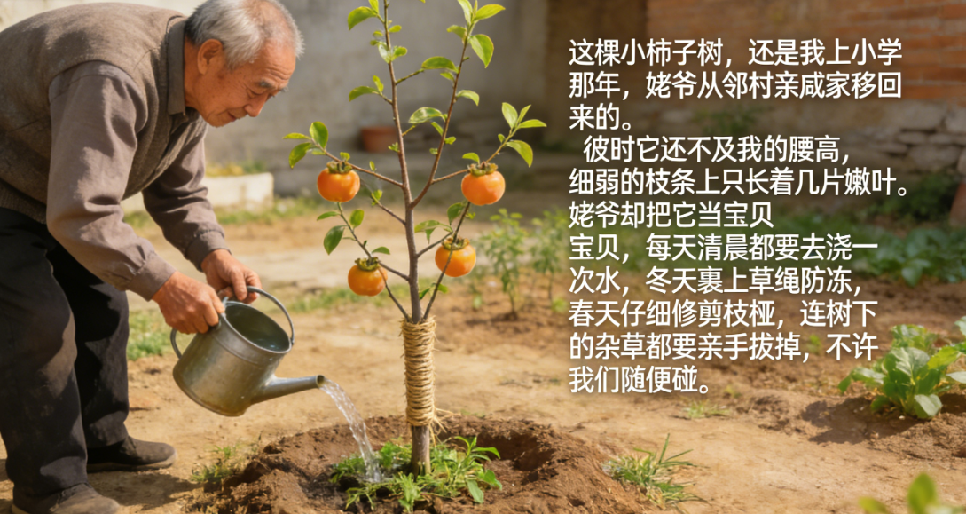 这棵小柿子树,还是我上小学那年,姥爷从邻村亲戚家移回来的。彼时它还不及我的腰高,细弱的枝条上只长着几片嫩叶。姥爷却把它当宝贝,每天清晨都要去浇一次水,冬天裹上草绳防冻,春天仔细修剪枝桠,连树下的杂草都要亲手拔掉,不许我们随便碰。