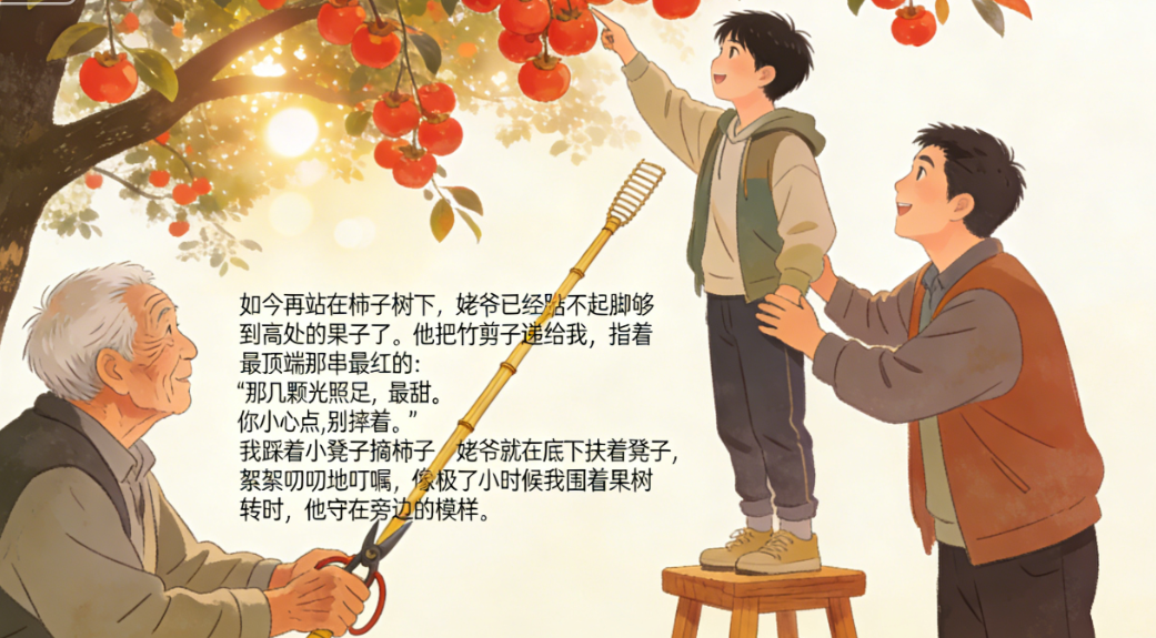 如今再站在柿子树下,姥爷已经踮不起脚够到高处的果子了。他把竹剪子递给我,指着最顶端那串最红的:“那几颗光照足,最甜。你小心点,别摔着。”我踩着小凳子摘柿子,姥爷就在底下扶着凳子,絮絮叨叨地叮嘱,像极了小时候我围着果树转时,他守在旁边的模样。
