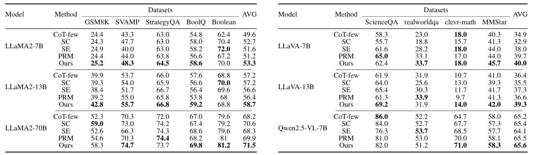 单模态推理任务:包括 GSM8K、SVAMP、StrategyQA、BoolQ 和 Boolean。 多模态推理任务:包括 ScienceQA、RealWorldQA、CLEVR-Math 和 MMStar。 Baseline:Few-Shot CoT、Self-Consistency、Self Evaluation Guided Beam Search、Process Reward Models Search。