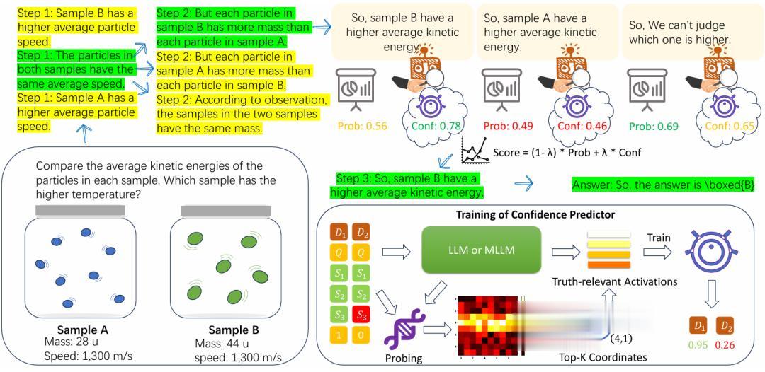 作者选取最敏感的几个注意力头,将其激活拼接,作为输入训练一个轻量预测器,输出对每一步推理的可信度评分。该评分不基于 Token 概率,而基于模型内部的深层表示,更能反映推理质量。