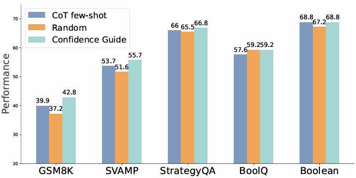 若将候选推理步骤「随机选择」而非依据可信度,本方法性能显著下降。随机策略在若干任务上甚至低于 Few-Shot CoT Baseline。