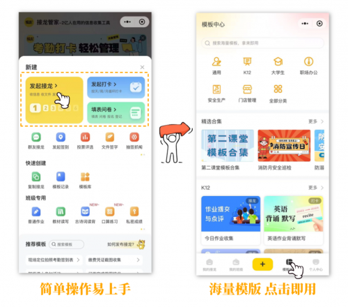 班主任的日常,离不开作业收集、缴费统计、阅读打卡、截图收集等琐碎工作。接龙管家提供海量现成模板,老师可轻松实现拿来即用。