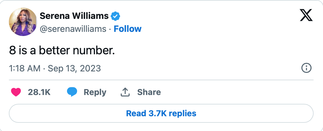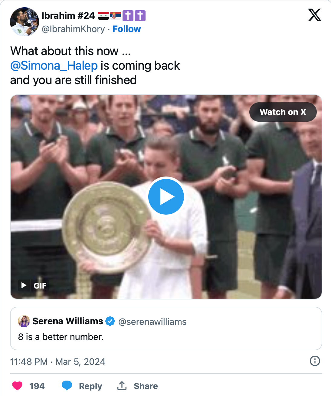 在西莫娜·哈勒普上诉成功后,网球迷们立即挖出了小威廉姆斯去年发布的社交媒体帖子,她在罗马尼亚人受到四年禁赛后立即发出了该帖子。“8是一个更好的数字。”小威在 X(以前的 Twitter)上写道。