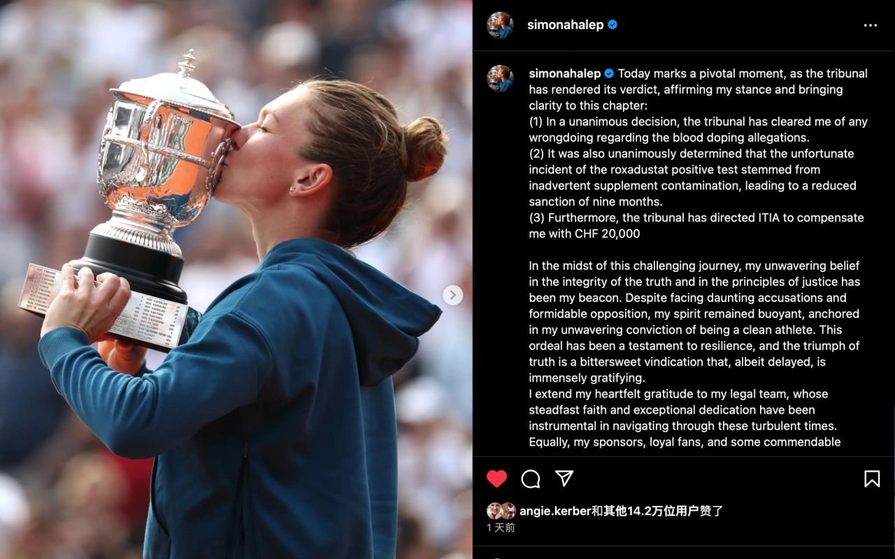 CAS判决结果出来后,哈勒普在社交媒体上发表了一篇衷心的帖子,庆祝兴奋剂禁令的解除。她为自己没有任何不当行为而感到高兴,并强调了自己在应对这一充满挑战的磨难时的韧性。